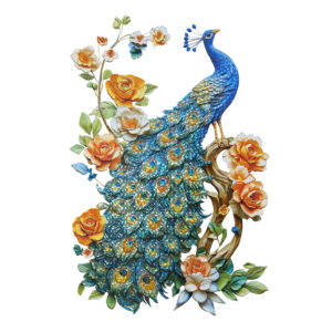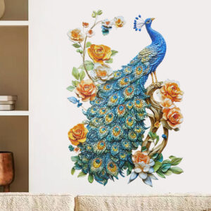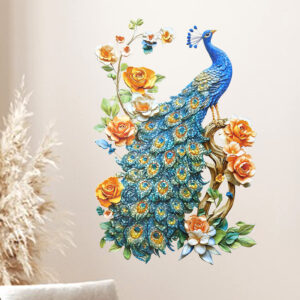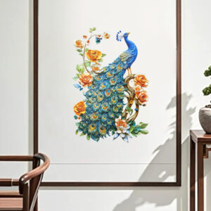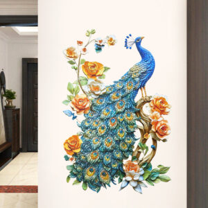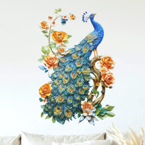 Decal dán tường hình chim công xanh kết hợp hoa hồng cam – biểu tượng của sự thịnh vượng, quý phái và may mắn trong phong thủy. Thiết kế nổi 3D cực kỳ bắt mắt, phù hợp để làm điểm nhấn cho không gian sống hiện đại.
