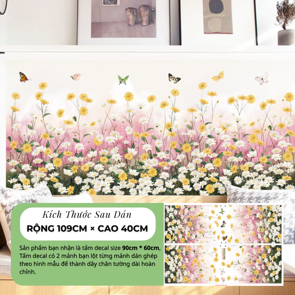 Mẫu decal được thiết kế với nhiều lớp hoa cúc trắng và vàng xen kẽ, phía sau là nền màu hồng nhẹ tạo chiều sâu cho bức tranh tường. Các chi tiết bướm bay phía trên giúp tổng thể trở nên sống động và tự nhiên hơn.