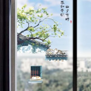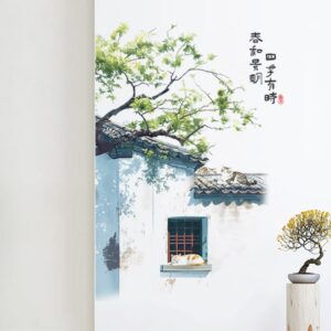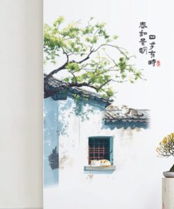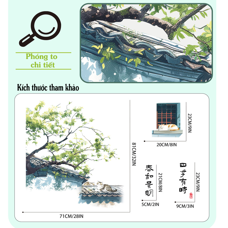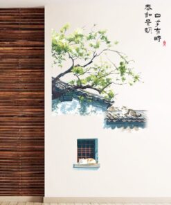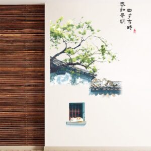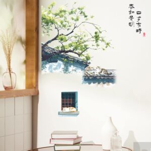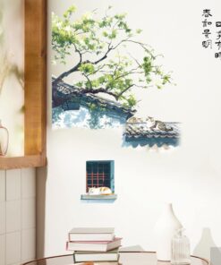 Decal Dán Tường Lá Bắc Âu Mèo Nghỉ Trưa Trên Mái Ngói Cổ Điển – Phong Cảnh Cây Xanh Nghệ Thuật, 86×113cm