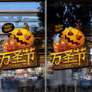 Decal Halloween 2025 phiên bản “bí ngô ma quái” là mẫu decal dán kính cao cấp dành riêng cho mùa lễ hội Halloween năm nay. Thiết kế nổi bật với quả bí ngô mặt quỷ, bàn tay zombie cùng cụm chữ Trung Quốc “万圣节” (Lễ hội Halloween) và dòng chữ “Trick or Treat” mang đậm tinh thần Halloween phương Đông kết hợp phương Tây. Tất cả tạo nên một tổng thể sinh động, thích hợp để dán mặt kính cửa hàng, quán nước, showroom, siêu thị…