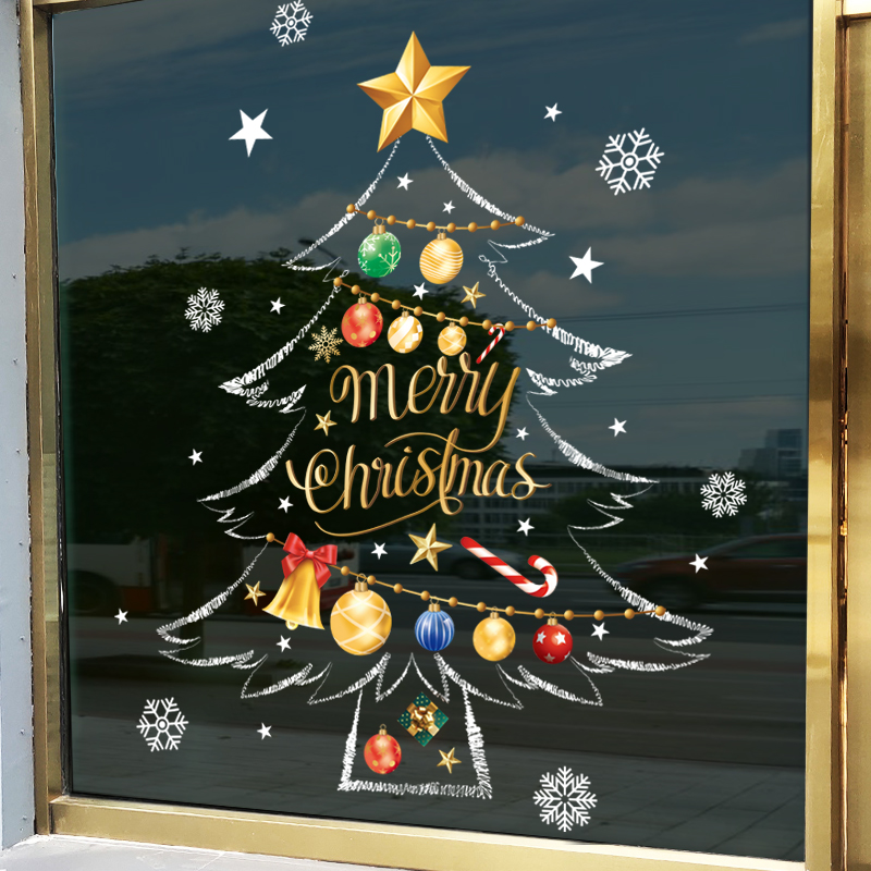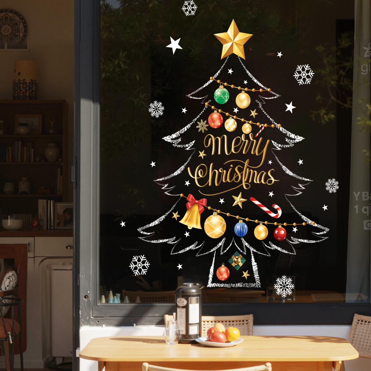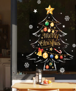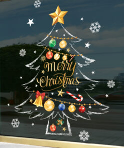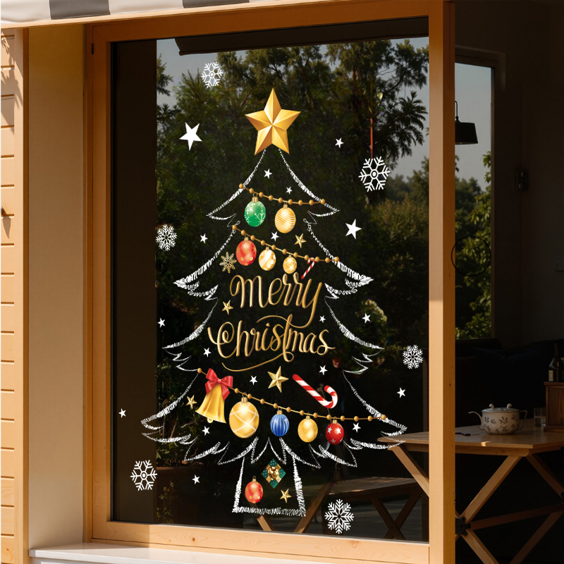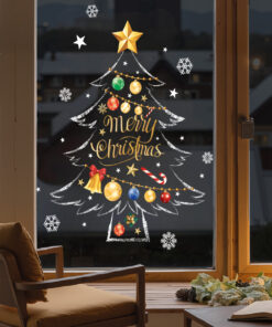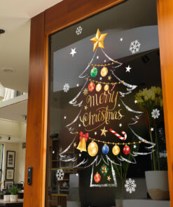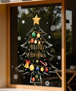 Ở trung tâm cây thông là dòng chữ “Merry Christmas” viết theo phong cách thư pháp vàng ánh kim vô cùng nổi bật. Khi dán lên kính, thiết kế tạo hiệu ứng chiều sâu đẹp mắt, giúp không gian trở nên ấm áp, sang trọng và lung linh ánh lễ hội.