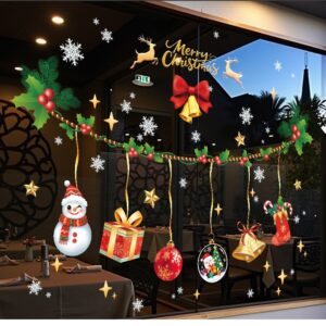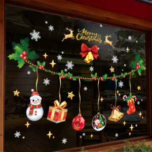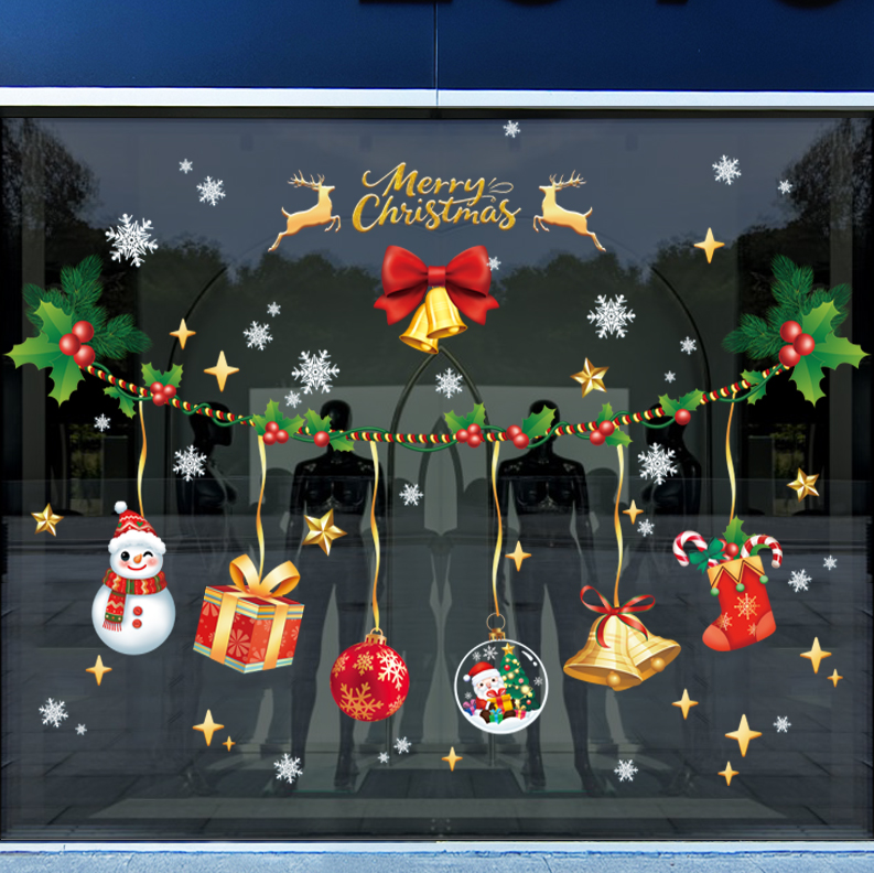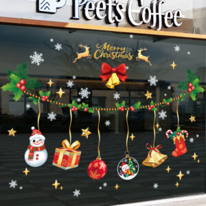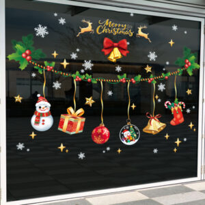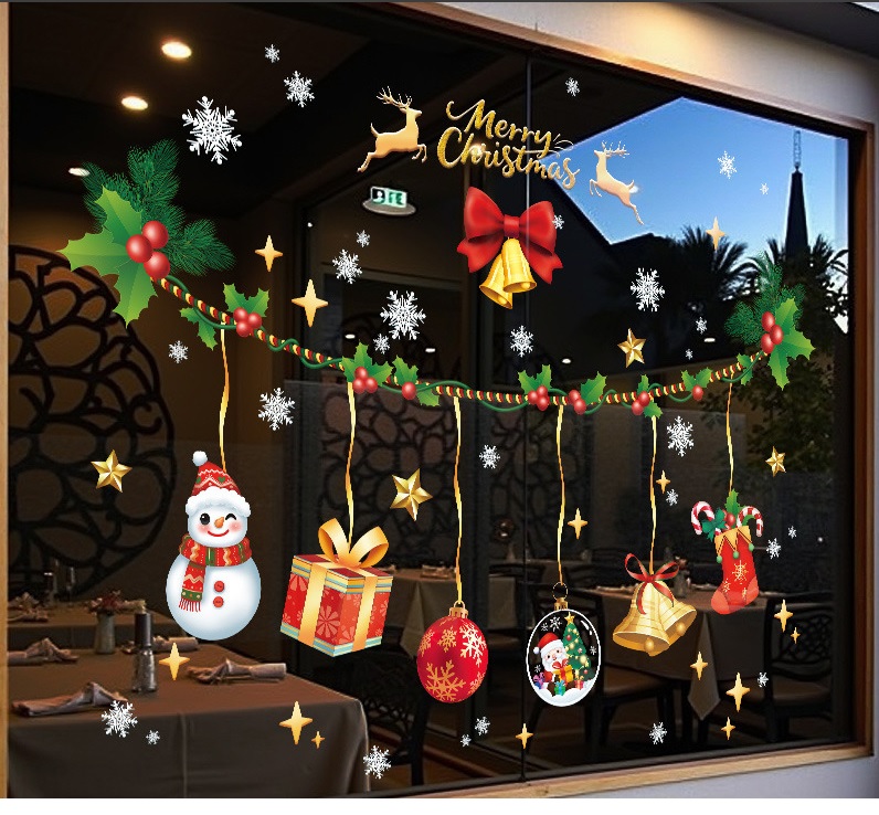 Decal Noel 2026 dây treo chuông – người tuyết – quà tặng khổ 45×60, chất liệu hít tĩnh điện bám kính chắc, dễ dán, trang trí cửa hàng – quán café cực nổi bật.