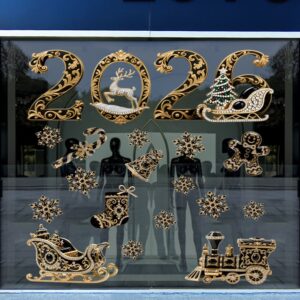 Decal Noel 2026 Đen Vàng Hoàng Gia là mẫu trang trí Giáng Sinh cao cấp bậc nhất tại MingDecor. Thiết kế lấy cảm hứng từ nghệ thuật Baroque châu Âu, với chi tiết uốn lượn hoàng gia, hoa văn mạ vàng và hiệu ứng đính đá sang trọng trên từng họa tiết. Bộ chữ 2026 nổi bật với tông đen – vàng kim – ánh bạc, kết hợp hiệu ứng ngọc trai và họa tiết 3D tạo độ sâu cực đẹp khi dán trên kính.