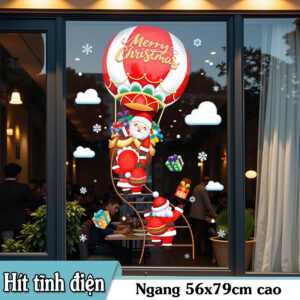 Decal Noel 2026 ông già Noel khinh khí cầu dễ thương, chất liệu hít tĩnh điện khổ 45×60, bám kính chắc – dễ dán – trang trí cửa hàng và nhà ở cực nổi bật.
