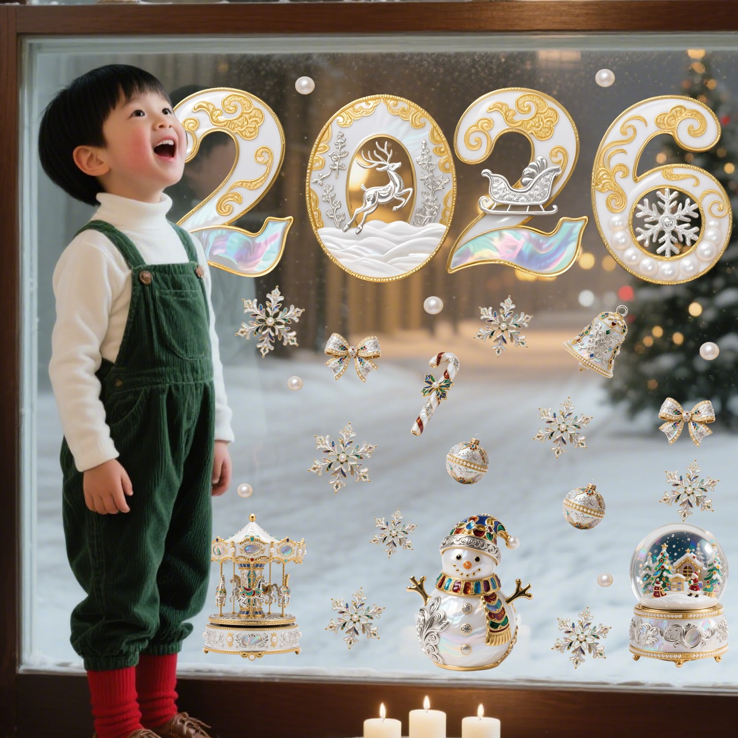 Điểm nhấn chính là số 2026 tone trắng – vàng ánh kim, kết hợp hiệu ứng opal cầu vồng nhẹ, thêm hạt ngọc trai trang trí và họa tiết bên trong như tuần lộc, xe kéo, hoa tuyết. Bên dưới là bộ họa tiết sang trọng gồm: bông tuyết nổi 3D, chuông vàng, nơ kim tuyến, kẹo gậy, người tuyết, vòng xoay ngựa gỗ & quả cầu tuyết – tất cả đều mang phong cách châu Âu cổ điển.