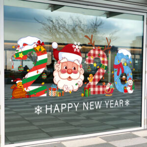 Decal Noel 2026 số 2026 hoạt hình kết hợp ông già Noel đáng yêu, khổ 30×50 nhỏ gọn, hít tĩnh điện dễ dán – không keo – phù hợp trang trí cửa kính mọi không gian mùa Giáng Sinh 2026.