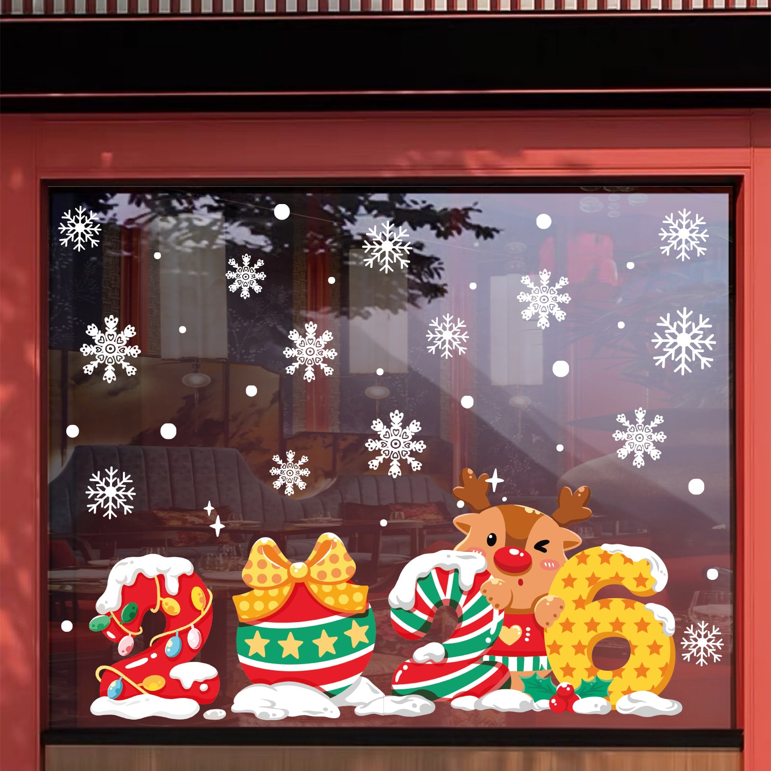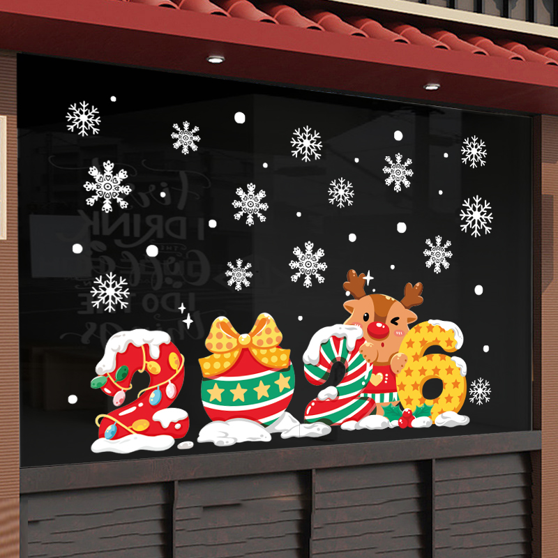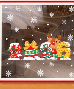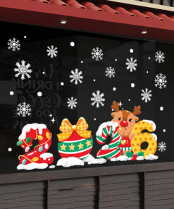 Decal Noel 2026 số 2026 và tuần lộc dễ thương khổ 50×70, hít tĩnh điện bám chắc, màu sắc nổi bật, trang trí cửa kính đẹp cho shop, quán café và gia đình.