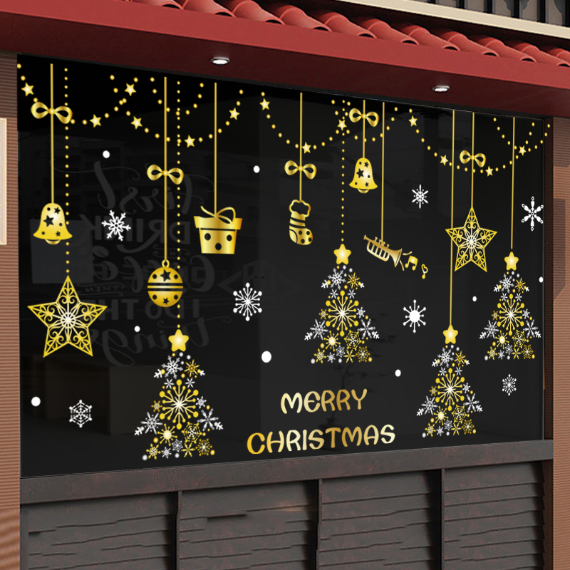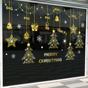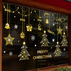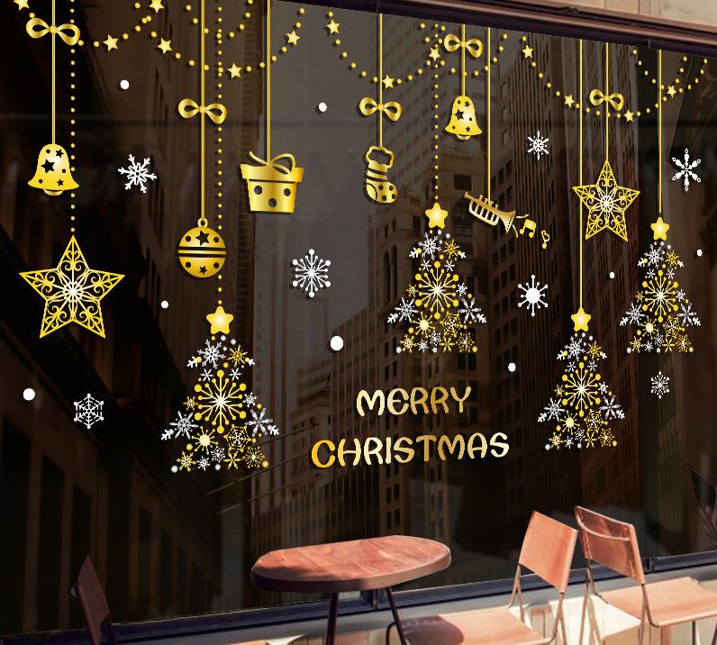Decal Noel 2026 treo vàng sang trọng, họa tiết cây thông – ngôi sao – chuông vàng, chất liệu hít tĩnh điện dễ dán, khổ 45×60 trang trí cửa kính đẹp nổi bật.
