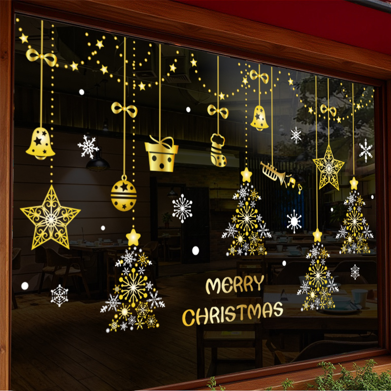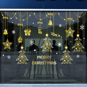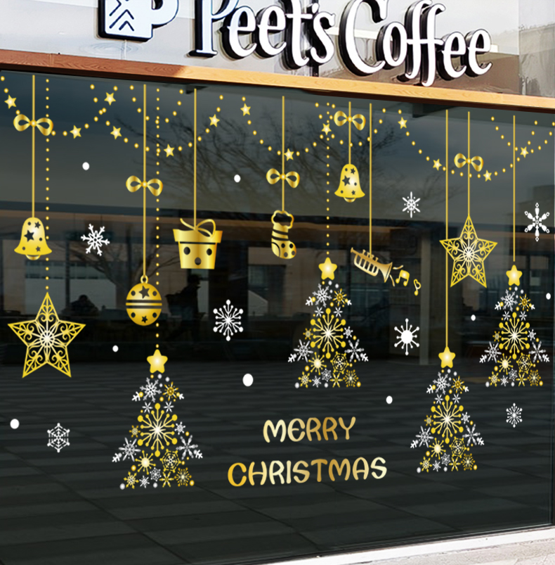 Với tông vàng kim kết hợp trắng tuyết, mẫu decal mang hơi thở của mùa lễ hội hiện đại và phong cách châu Âu, giúp cửa kính trở nên nổi bật và thu hút ánh nhìn ngay lập tức. Thiết kế treo dọc giúp không gian tươi sáng và tạo chiều sâu, làm cho mặt tiền cửa hàng trở nên ấm áp và chuyên nghiệp hơn.