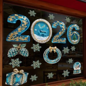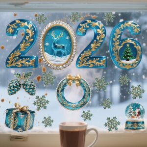 Decal Noel 2026 xanh ngọc hoàng gia, họa tiết vàng sang trọng, hít tĩnh điện dễ dán – không keo. Trang trí Giáng Sinh đẹp cho cửa hàng & nhà ở. Mẫu cao cấp tại MingDecor.