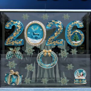 Bộ chữ 2026 được tạo hình bằng lớp phủ xanh ngọc bóng mịn, đi kèm họa tiết Baroque vàng uốn lượn và đường viền pha đá lấp lánh. Ở giữa là hình tuần lộc tuyết trong khung oval đính đá, bên cạnh là cây thông và họa tiết tuyết tinh xảo, giúp không gian như bừng sáng trong mùa lễ hội.