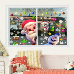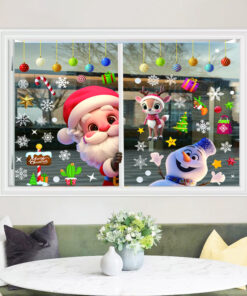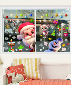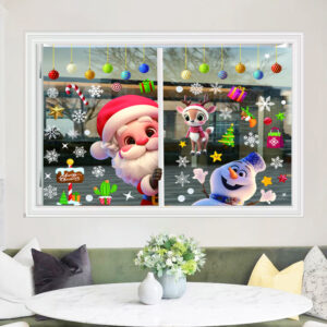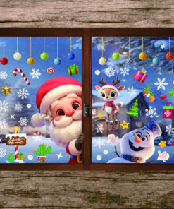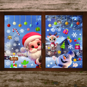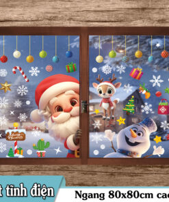 Thiết kế tươi sáng, màu sắc nổi bật với hình ảnh ông già Noel, người tuyết, tuần lộc, kẹo que, hộp quà, ngôi sao tuyết – phù hợp cho cửa kính quán cafe, shop thời trang, văn phòng, nhà ở…