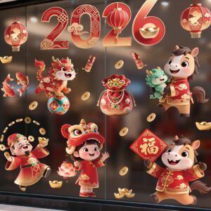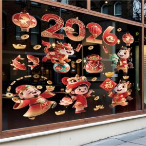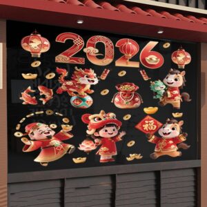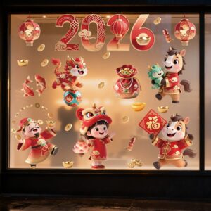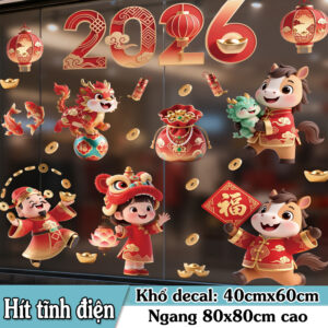 Decal Tết 2026 bé múa lân, ngựa con may mắn, thỏi vàng & đèn lồng đỏ. Hít tĩnh điện không keo – khổ 40×60cm. Trang trí cửa hàng & nhà ở siêu đẹp, mua tại MingDecor.