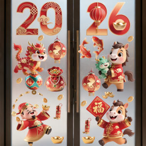 Thiết kế theo phong cách Tết truyền thống kết hợp hoạt hình, tông màu đỏ – vàng tài lộc, cực kỳ nổi bật khi dán lên cửa kính.