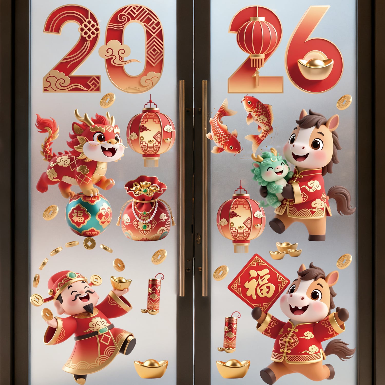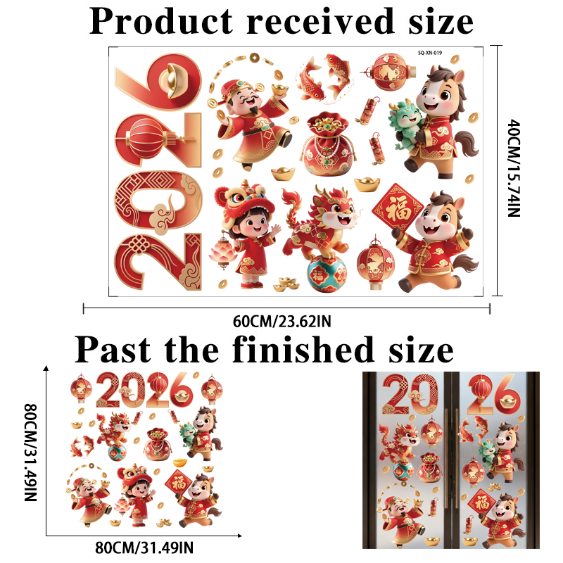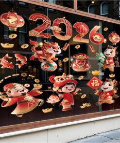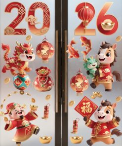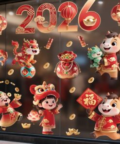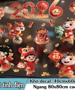 Decal Tết 2026 bé múa lân, ngựa con may mắn, thỏi vàng & đèn lồng đỏ. Hít tĩnh điện không keo – khổ 40×60cm. Trang trí cửa hàng & nhà ở siêu đẹp, mua tại MingDecor.