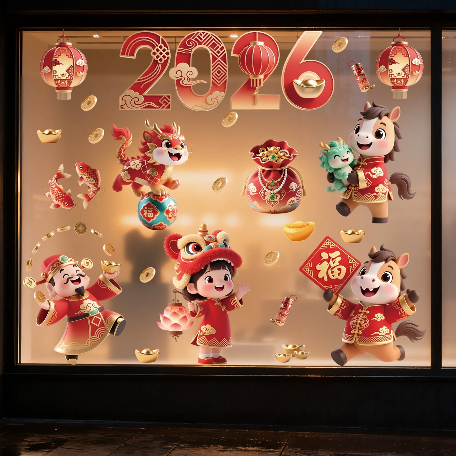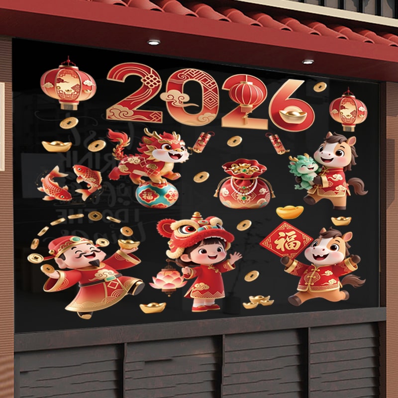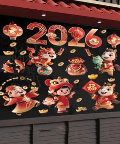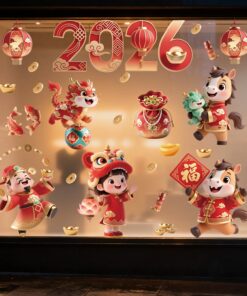 Thiết kế theo phong cách Tết truyền thống kết hợp hoạt hình, tông màu đỏ – vàng tài lộc, cực kỳ nổi bật khi dán lên cửa kính.
