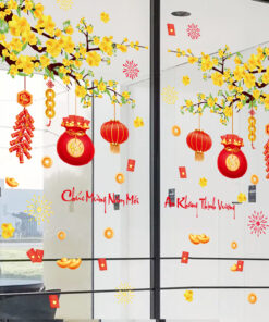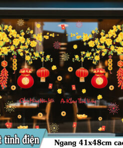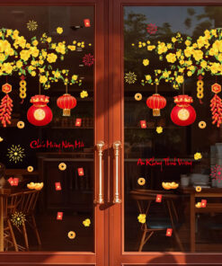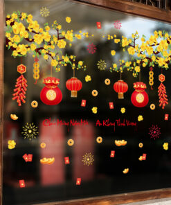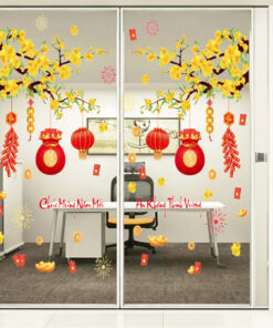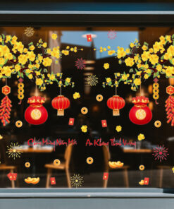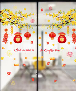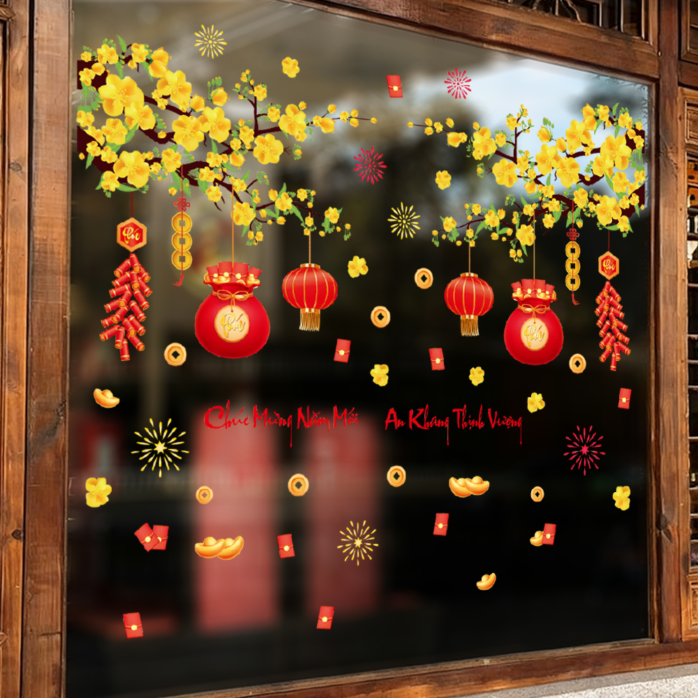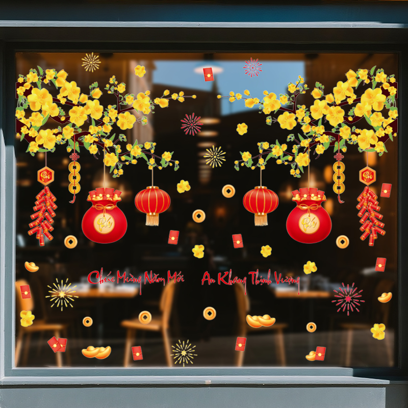Mẫu decal mang vẻ đẹp truyền thống Việt Nam, nổi bật với sắc mai vàng – đèn lồng đỏ – chữ thư pháp đỏ, tạo nên không khí Xuân rực rỡ và thu hút từ cái nhìn đầu tiên.
