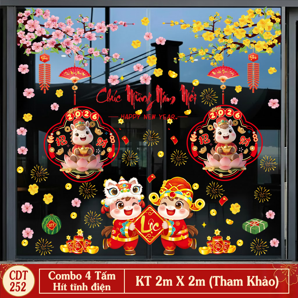 Decal Tết 2026 hít tĩnh điện combo 4 tấm – mã CDT252 mang phong cách tươi vui, rực rỡ với hình ảnh bé phát tài ôm thỏi vàng, chữ Lộc may mắn, kết hợp hoa mai vàng – hoa đào hồng tượng trưng cho phúc – lộc – thịnh vượng đầu năm mới.