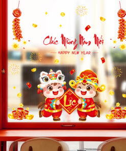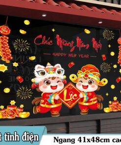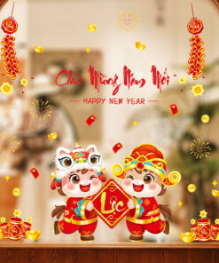 Trung tâm của mẫu decal là hình ảnh hai bé Tết dễ thương: