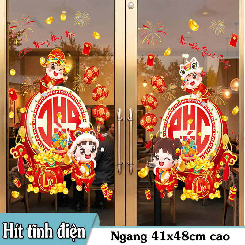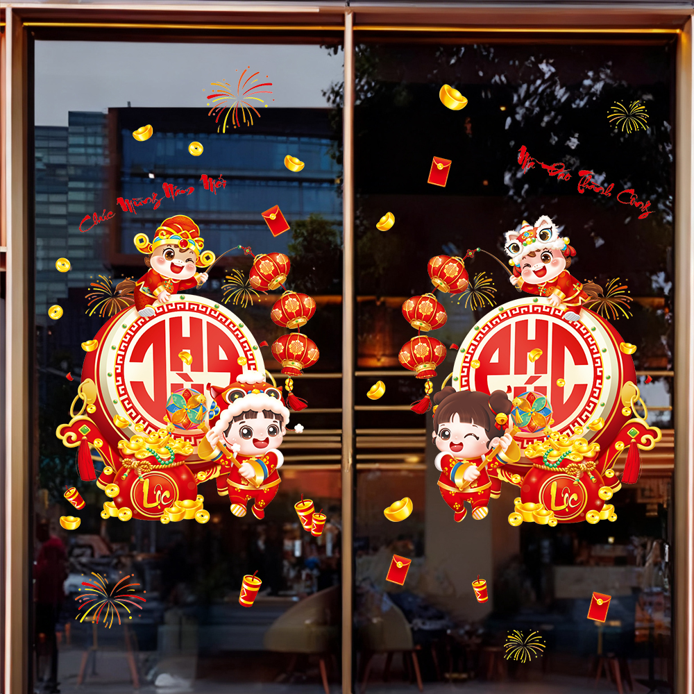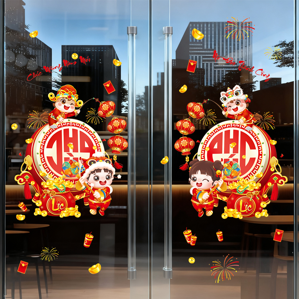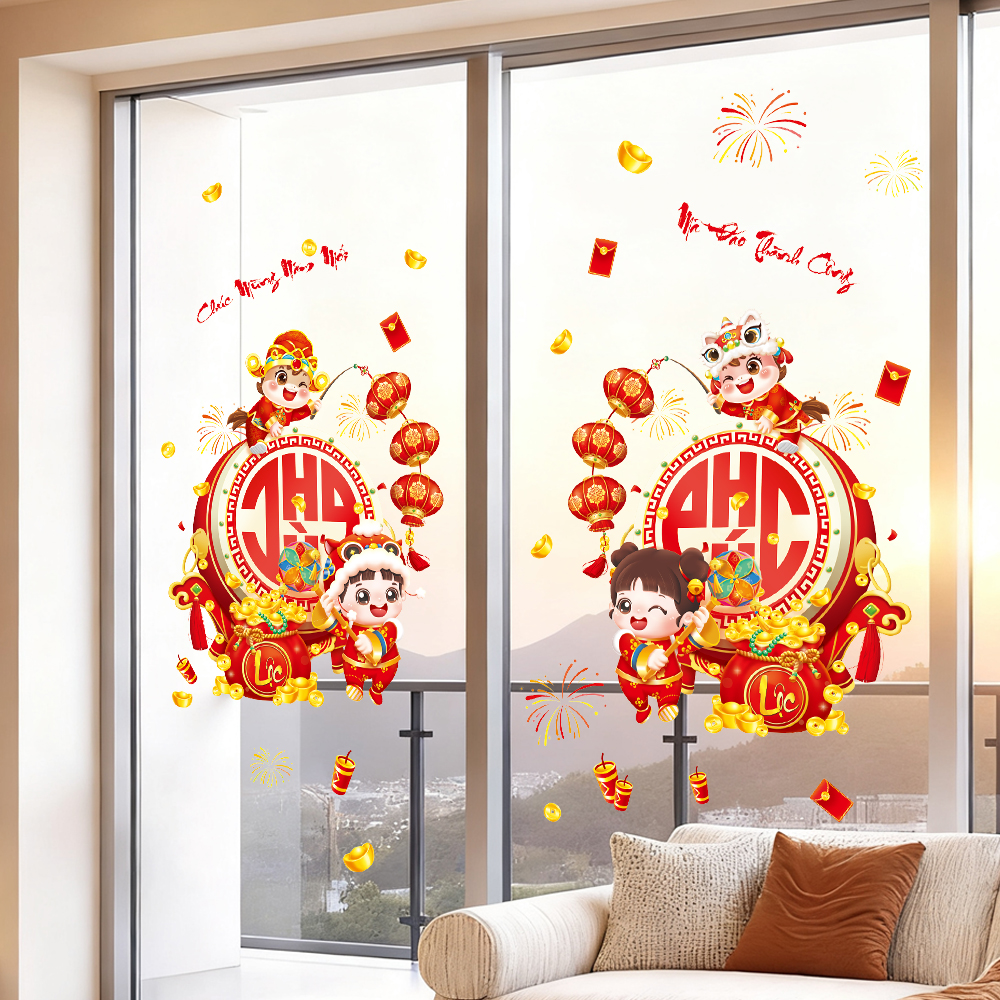 Trong bộ sưu tập Tết 2026, mẫu Decal Tết Bé Cầm Trống – Bé Múa Lân – Lì Xì May Mắn (Khổ 60×90 cm) là một trong những thiết kế nổi bật nhất, bởi sự kết hợp hoàn hảo giữa màu đỏ – vàng truyền thống và nhân vật hoạt hình cực kỳ đáng yêu.
