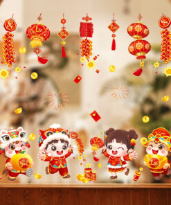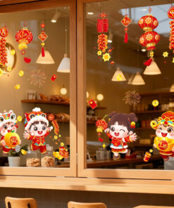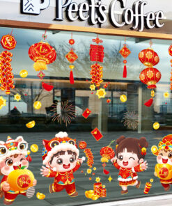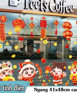 Mẫu decal này đặc biệt phù hợp cho không gian hiện đại muốn vừa vui nhộn, vừa sang trọng, đậm chất Tết truyền thống.