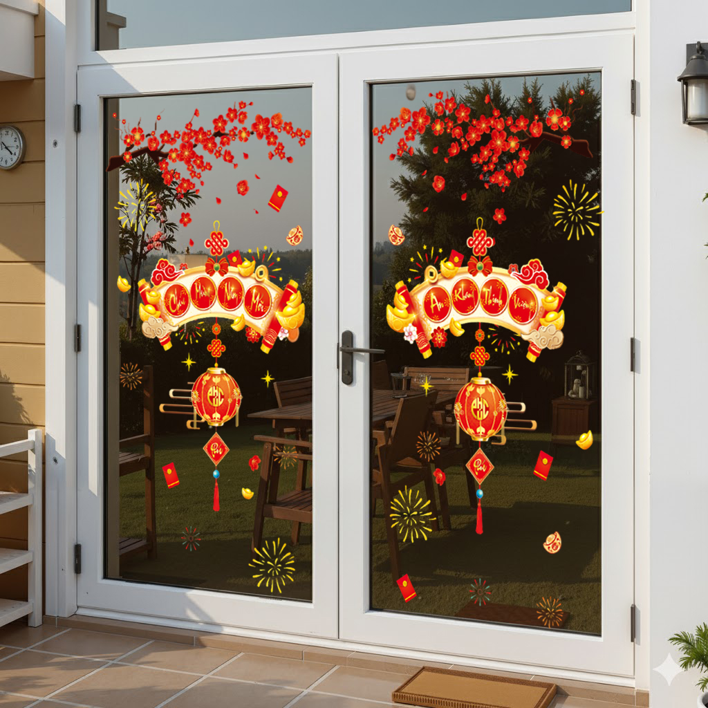 Mẫu decal mang phong cách đỏ – vàng đậm chất Tết Việt, phù hợp để trang trí: