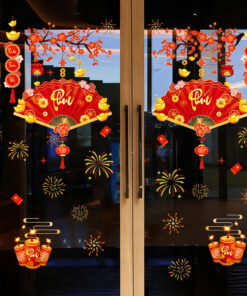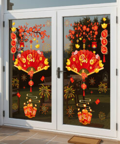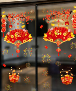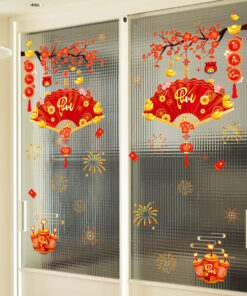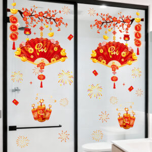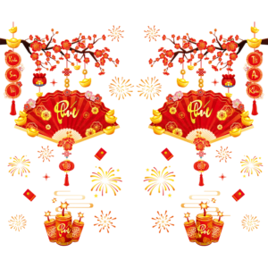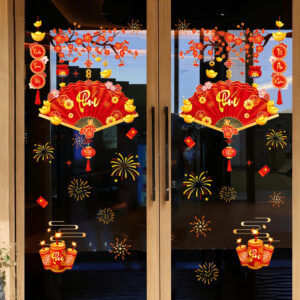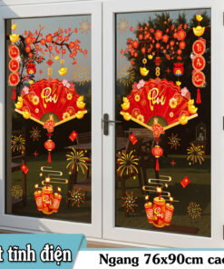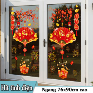 🎋 Decal Tết Quạt Phú 2026 – Cành Đào Đỏ & Pháo Hoa – Hít Tĩnh Điện | Khổ 60×90 cm Trang Trí Cửa Kính Tết Sang Trọng