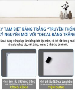 Khác với bảng trắng treo tường nặng nề, dễ bám bẩn, khó di chuyển, sản phẩm decal bảng trắng PET có từ tính được thiết kế đặc biệt để dán trực tiếp lên tường, kính, tủ gỗ, bề mặt nhẵn,… Sản phẩm có lớp keo sẵn mặt sau, chỉ cần bóc và dán, không cần khoan tường hay tốn công lắp đặt.