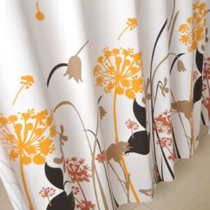 Mẫu rèm nổi bật với họa tiết hoa, bướm và cỏ trang trí được thiết kế mềm mại và tinh tế. Các chi tiết hoa màu vàng và nâu tạo điểm nhấn nổi bật trên nền trắng, giúp không gian phòng tắm trở nên sinh động hơn.