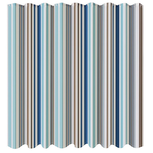 Mẫu rèm nổi bật với họa tiết sọc dọc nhiều màu sắc như xanh, nâu và trắng. Các đường sọc được thiết kế cân đối giúp tạo cảm giác hiện đại và gọn gàng cho không gian phòng tắm.